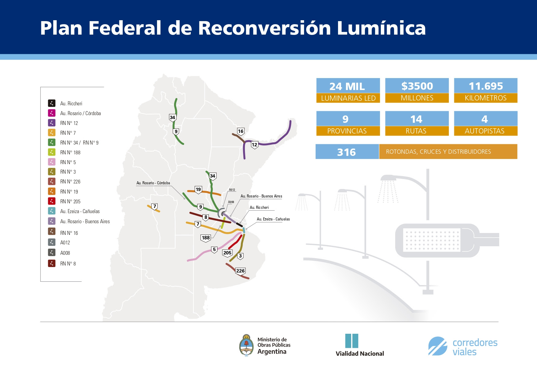 “Estamos invirtiendo 3.500 millones de pesos en un plan que contempla modernizar las rutas nacionales, iluminando una extensión de 11.695 kilómetros, sumando ambos sentidos de la traza, cruces y rotondas. Una ruta mejor iluminada impacta directamente mejorando los índices de siniestralidad vial”, afirmó su titular Gonzalo Atanasof, en un comunicado.